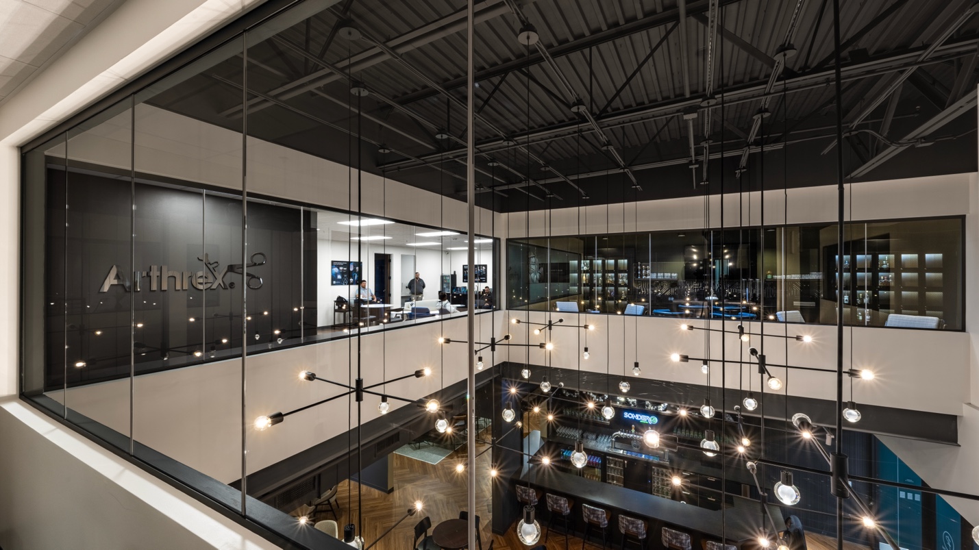 A craft beer taphouse featuring Sonder Brewing, a robotic coffee bar featuring Script Coffee, 50 personal bourbon lockers, a commercial culinary lab, a golf simulator, a 12×10 ft video wall — 25,000+ sq ft of space that exists because two business owners refused to settle for a generic office.